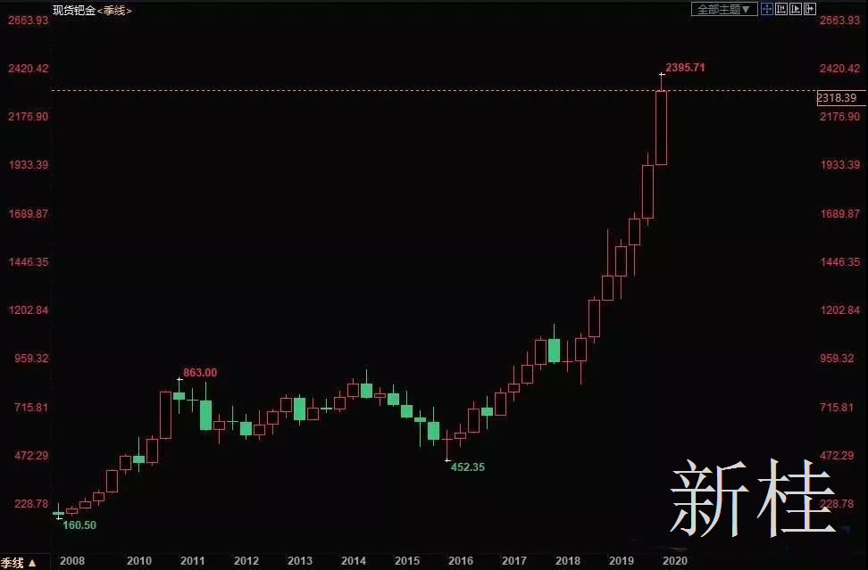 2020年一月份的第三周,钯金继续高歌猛进,周四现货钯金价格创下每盎司2395.71美元的纪录高位,一度劲升5.7%,涨幅每盎司近130美元,创出最大的盘中纪录涨幅。这种催化转化器中使用的贵金属今年以来表现强劲,在去年飙升54%之后,到2020年又上涨了18%。其涨幅令即使是经验最丰富的市场观察家也感到惊讶,他们说紧张的供应状况几乎没有缓解可能。主要生产国南非报告其铂族金属生产在11月份大幅下滑。