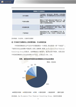 中间体是精细化工产品当中非常重要的一个类型,其实质是一类“半成品”,下游涉及行业主要集中在医药、农药、染料等。据统计,2014年全球精细化工市场中,医药及其中间体、农药及其中间体是精细化工行业的前两大子行业,分别占比69%、10%。