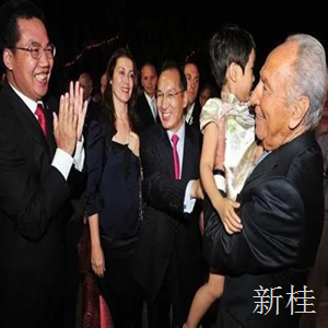 以色列总统西蒙?佩雷斯(右一)和时任中国驻以色列大使赵军(右二)、中以友协主席燕妮(左二)、时任中国驻以色列经济商务参赞周惠(左一)在活动中