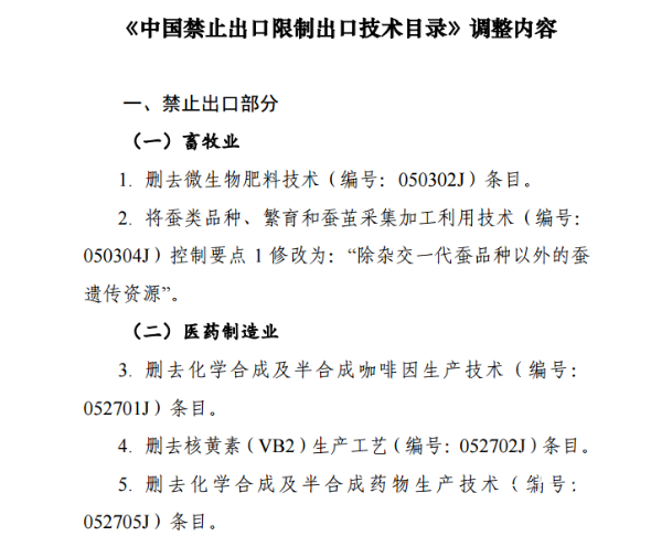 828,商务部、科技部发布《中国禁止出口限制出口技术目录》其中对医药制造业做了如下规定: