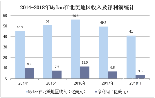 不仅仅是TEVA,从Mylan的财报中也可以看出其美国仿制药业务近年来开始承受到较大的业绩压力。2017、2018Mylan在北美地区收入和利润连续两年呈现下滑态势。2018Mylan在北美洲营收41亿美元,净利润3.3亿美元。
