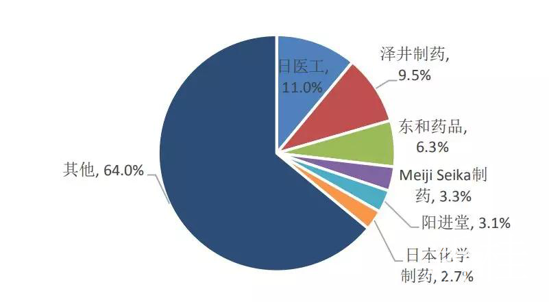 日本仿制药企业的数量在近十年维持在30家左右的水平。其中,2016年日本以仿制药为主业的药企达到32家,占处方药企业数量的30%左右,占日本所有药企数量的11%。从市场份额上看,前六大领军企业日医工、泽井制药、东和药品、Meiji Seika制药、阳进堂和日本化学制药合计占据了36%左右的市场份额