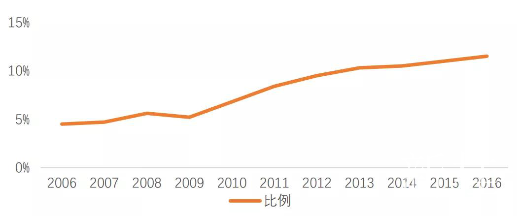印度仿制药的发展经历了医药产品专利取消、并购浪潮、跨国合作+研发三大阶段,因此它的仿制药在世界的影响力是毋庸置疑的。目前印度的仿制药药品销往全球包括美国、英国、德国等在内的数十个国家,其中美国更是印度仿制药的最大进口来源国。根据Motilal Oswal调研数据显示,印度仿制药在美国仿制药市场比例在不断提高,从2006年的4.5%增长到了201611.5%。
