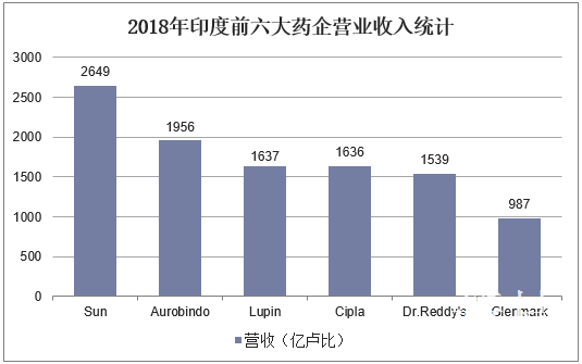 从印度的前六大药企营收来看,Sun、Aurobindo、LupinCipla、DrReddy’sGlenmark2018年合计销售额达到10404亿卢比,约合151亿美元,约合人民币1040亿元,最大的Sun的销售额达到265亿元。