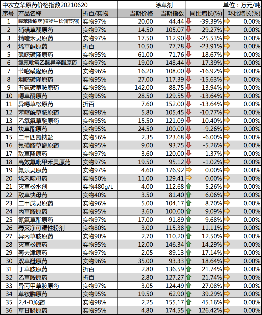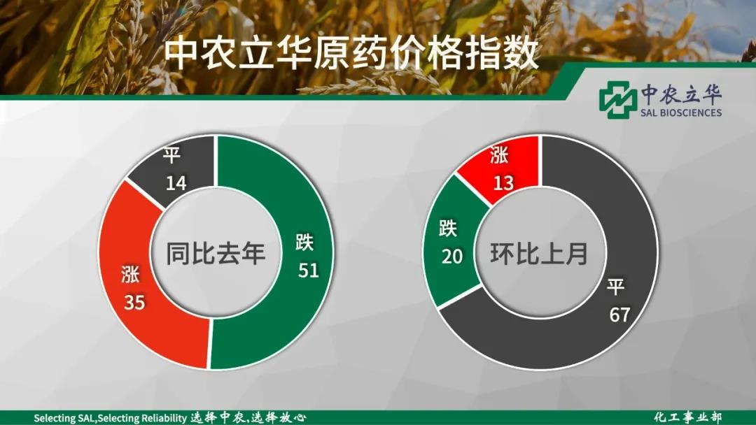 上涨:草甘膦原药、丁草胺原药、乙草胺原药、2,4-D原药、二甲戊灵原药、草铵膦原药、氰氟草酯原药、丙草胺原药、异丙草胺原药、异丙甲草胺原药、莠灭净可湿性粉剂、莠去津原药、灭草松原药、双草醚原药等