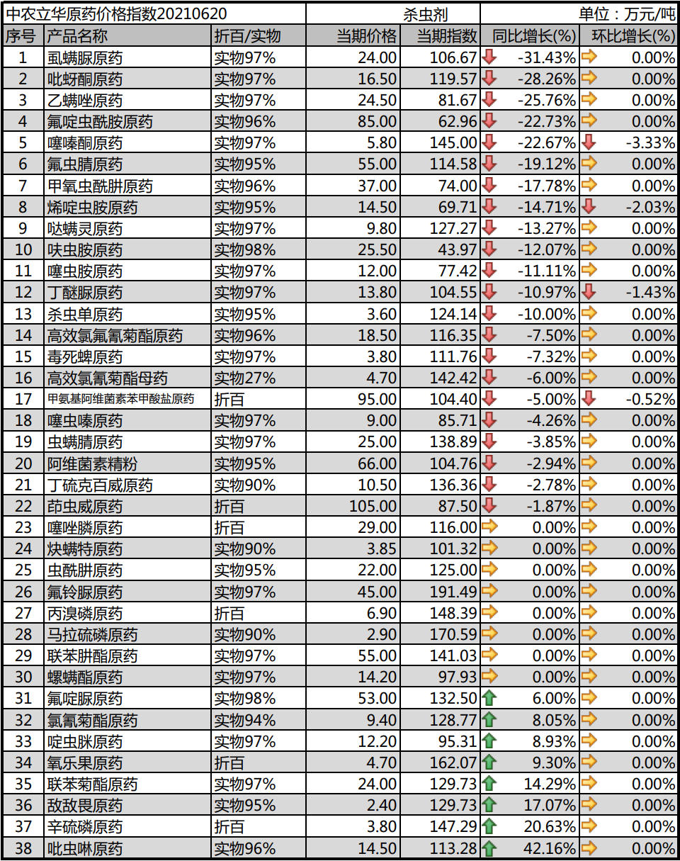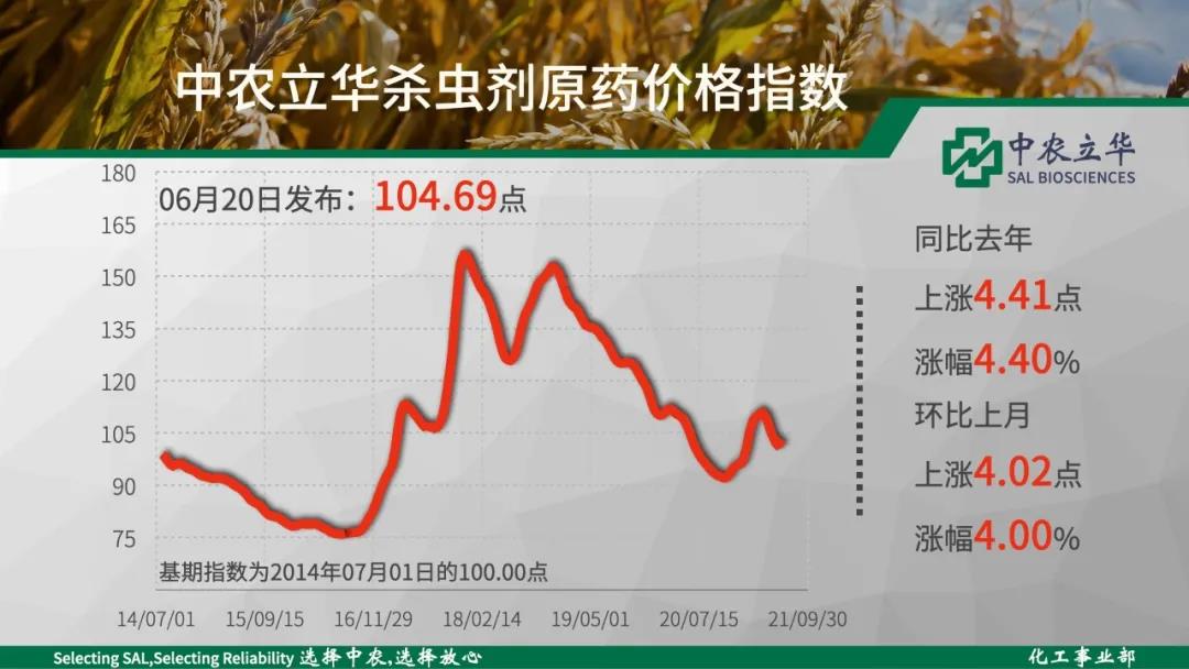 2021年06月20日中农立华杀虫剂原药价格指数报104.69点,环比上月大幅上涨4.00%。