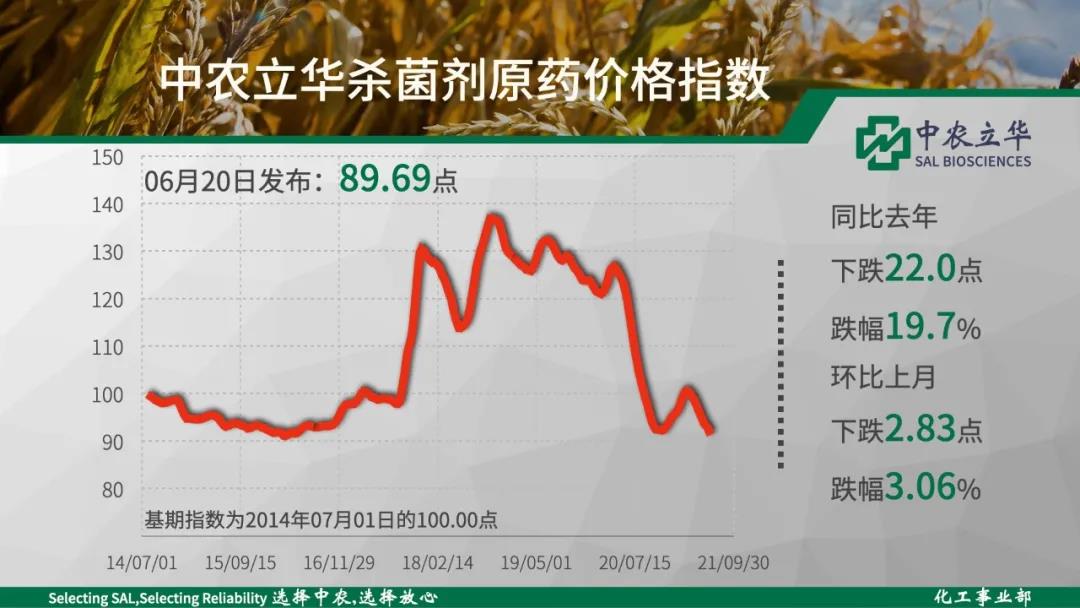 2021年06月20日中农立华杀菌剂原药价格指数报89.69点,环比上月大跌3.06%,三唑类是目前农药大类中,最为颓势的品种。仅丙环唑原药逆势上涨。