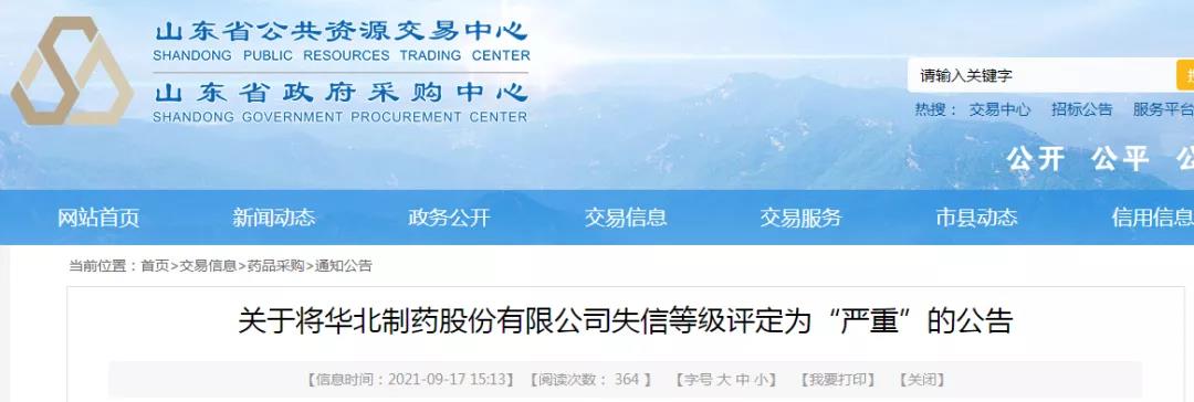 2021年9月17日,山东省公共资源交易中心发布关于将华北制药股份有限公司失信等级评定为“严重”的公告。