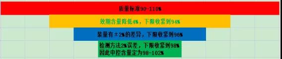 对于储存期间含量逐渐下降的品种,中控含量限度除了要包容方法的误差外,还要包容含量降低的幅度。假如成品的含量限度是90.0%-110.0%,含量在效期内预期降低6%,检测误差不会超过2%,则中控限度应定为98.0%-102.0%。