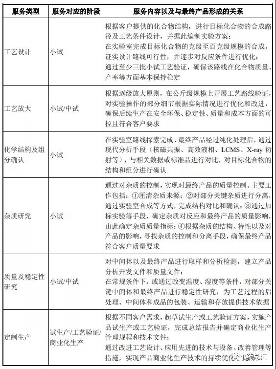 第一、CDMO 服务是最终商品形成的业务过程。公司为客户提供的 CDMO 服务的主要目标是按照客户要求成功研发出具备商业化生产可行性的医药中间体或原料药等产品。CDMO 服务是最终产品得以形成的过程。公司提供的各项 服务内容及其与最终产品形成的关系如下: