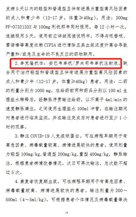 除中成药外,新版诊疗方案将国家药监局批准的两种特异性抗新冠病毒药物纳入,即利托那韦片(Paxlovid)和安巴韦单抗/罗米司韦单抗注射液。