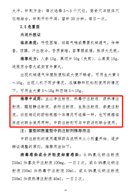 藿香正气胶囊(丸、水、口服液)、金花清感颗粒、连花清瘟胶囊(颗粒)、疏风解毒胶囊(颗粒)、喜炎平注射液、血必净注射液、参附注射液、生脉注射液被推荐5次(第四版-第八版均被推荐);