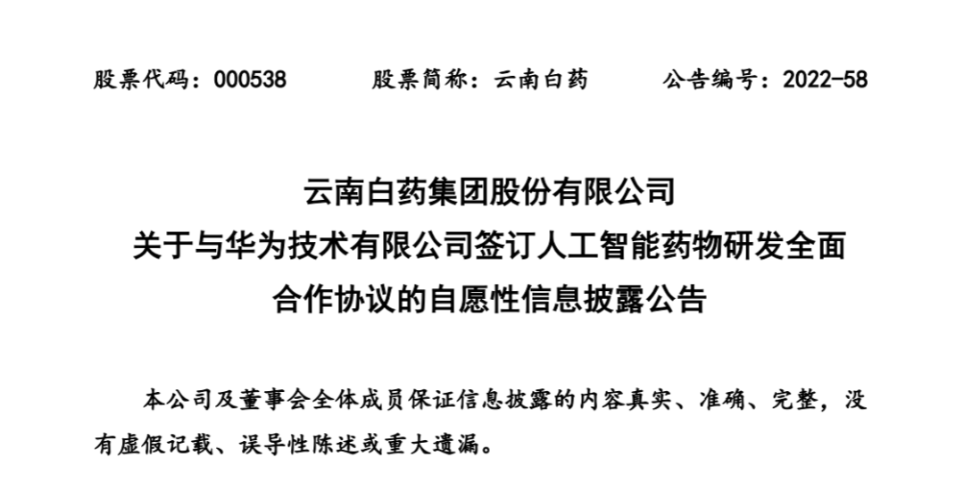 7月25日,云南白药公告称,与华为达成全面合作,双方将在人工智能药物研发领域开展交流与合作,探索联合科研创新机制,包括但不限于大小分子设计、相关病症、数据库开发等。