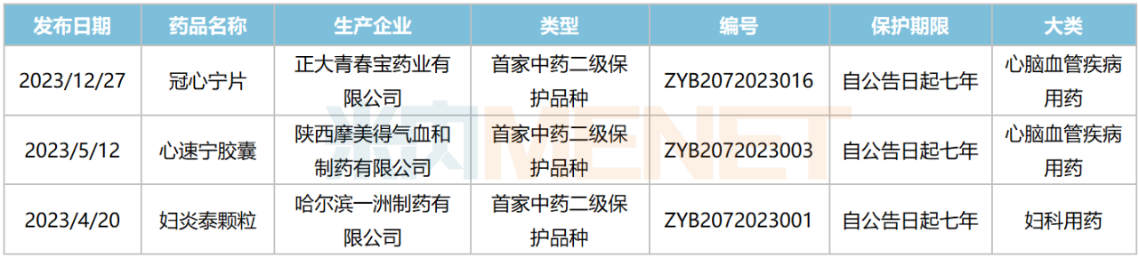 2023年国家药监局共发布了3个获批首家中药二级保护品种的公告,涉及正大青春宝药业的冠心宁片、陕西摩美得气血和制药的心速宁胶囊、哈尔滨一洲制药的妇炎泰颗粒3个独家品种(含独家剂型,下同),涵盖心脑血管疾病用药、妇科用药2个治疗大类。