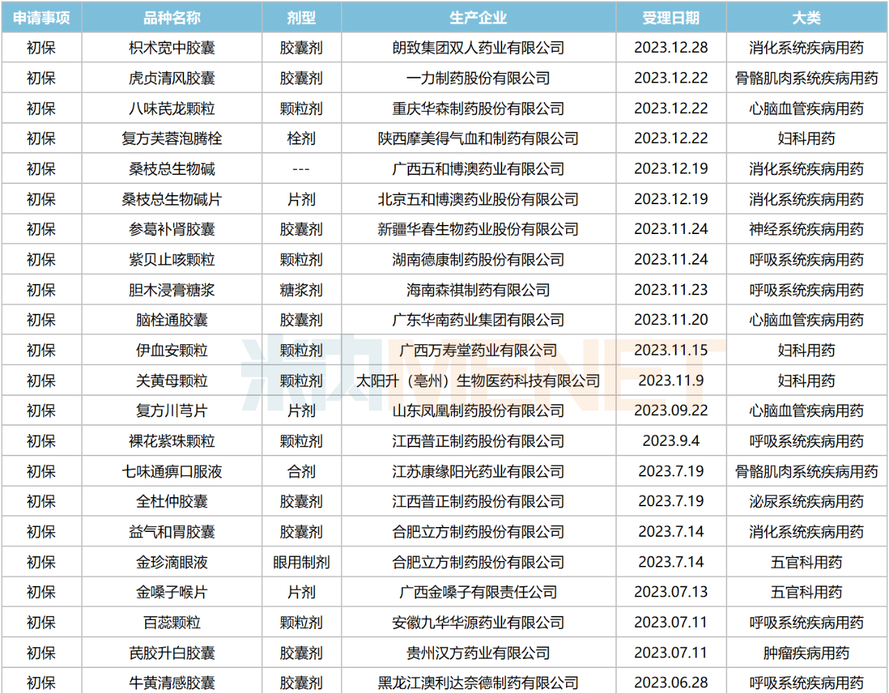2023年申请初保的中成药