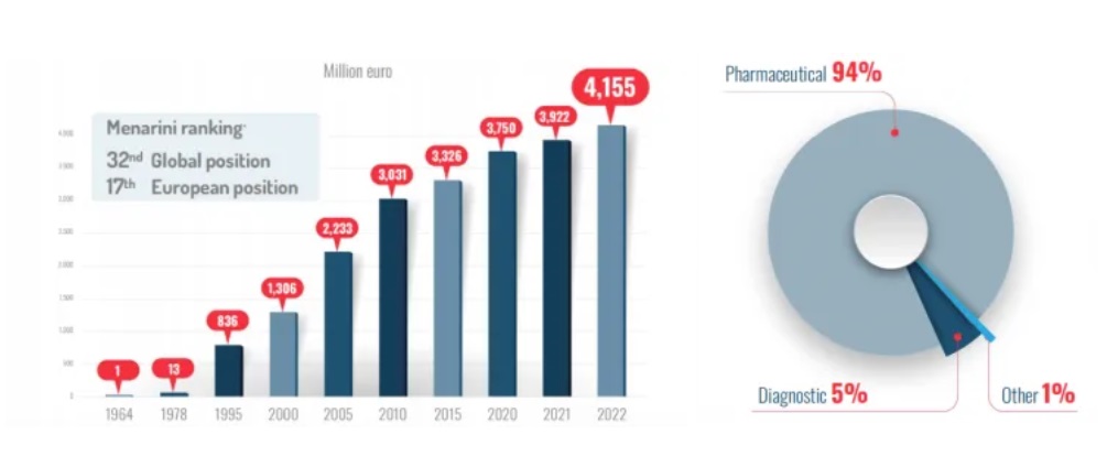 从药融云数据库获悉,成立于1886年的Menarini是意大利一家专注于心血管疾病、炎症镇痛、胃肠道疾病、肿瘤和代谢疾病的制药公司,总部设在佛罗伦萨,2022年统计的全球范围内员工高达17700多名,9个研发中心,且其附属公司、分销商和特许经营公司遍布全球140个国家。公司旗下有三个部门,分别是Menarini Ricerche,Menarini Biotech和Menarini Diagnostics。其中,Menarini Ricerche美纳里尼研究中心负责从新项目的创建到药物注册的所有研发活动;Menarini Biotech美纳里尼生物科技专注于心血管疾病、炎症镇痛、胃肠道疾病、肿瘤和代谢性疾病领域;Menarini Diagnostics美纳里尼诊断拥有遍布全球的附属合作伙伴和分销网络,专注于糖尿病、血液学、临床化学、尿液分析和免疫学,为专业医疗人员提供医疗诊断所需的科技方案。