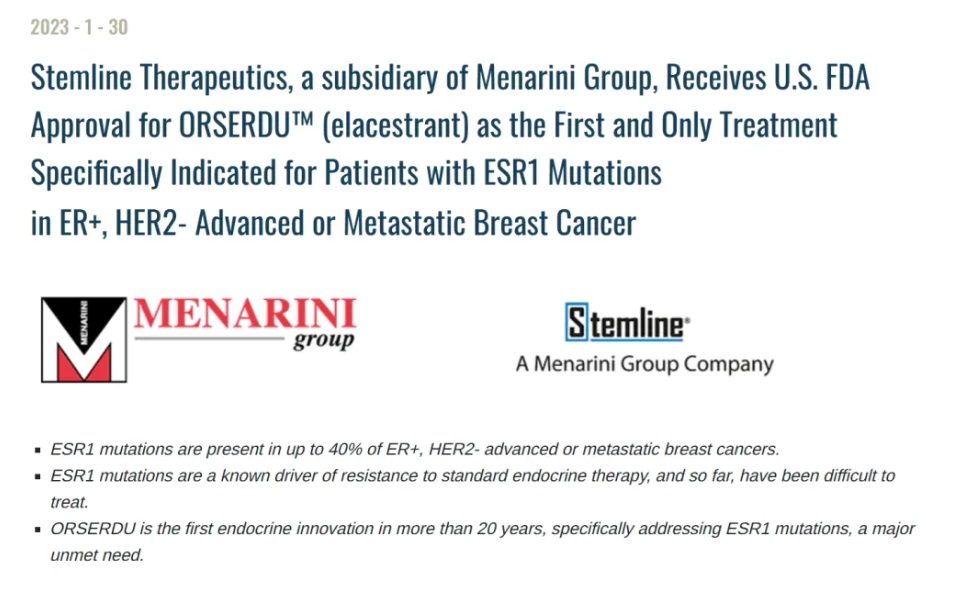 2、20231月,FDA批准ElacestrantOrserdu)用于既往接受过至少一线内分泌治疗后疾病进展的ER+、HER2-、ESR1突变的绝经后女性或成年男性晚期或转移性乳腺癌患者。在美国和欧洲由Menarini的全资子公司Stemline TherapeuticsOrserdu商业化,这也是FDA批准的首个口服SERD(选择性雌激素受体降解剂),在此之前,阿斯利康的氟维司群(fulvestrant)是唯一获批上市的SERD靶向药,但是只能肌肉注射。