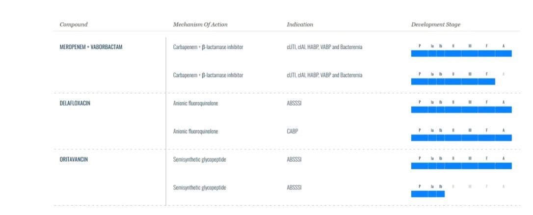 德拉沙星是一种阴离子氟喹诺酮类药物(FQ),与其他氟喹诺酮类药物相比,具有更好的特性和安全性。它通过平衡抑制细菌DNA复制、转录、修复和重组所需的细菌拓扑异构酶IV和DNA回旋酶(拓扑异构酶II)发挥作用。目前已在美国和欧盟获批用于治疗成人急性细菌性皮肤和皮肤结构感染(ABSSSI);在美国用获批于治疗社区获得性细菌性肺炎(CABP);20214月,在欧盟被批准用于治疗CABP